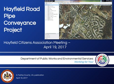Hayfield Farm residents may contact Dave Anglin about any pipe project issues at 703-324-5500 or dave.anglin@fairfaxcounty.gov . For more information about this project, refer to these Hayfield News issues:  Oct 2019 “Stormwater Pipe Background,” pp 9, 11 and “Hayfield Road Pipe Conveyance System Update,” pp 11, 13; Nov 2019, page 9 where several websites are listed; one recommended web site is http://www.hayfieldfarmva.com/about-us/stormwater. Other issues include:  Dec 2019, pp 11-17; Jan 2020 pp 9, 11; Feb, pp 9, 11, 13; March, pp 11, 13. April, pp 5-7; May, pp 9, 11, 13; June, pp 9, 11, 13. Recent and past Hayfield News issues are located at http://www.hayfieldfarmva.com/newsletters. You can see the Fairfax County website about this project at https://www.fairfaxcounty.gov/publicworks/stormwater/plans-projects/hayfield-road-pipe-conveyance-project