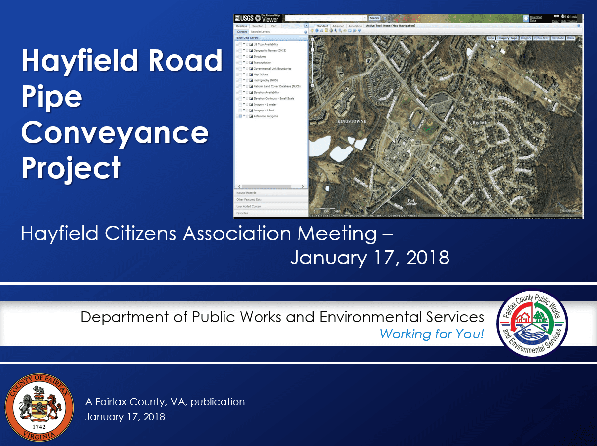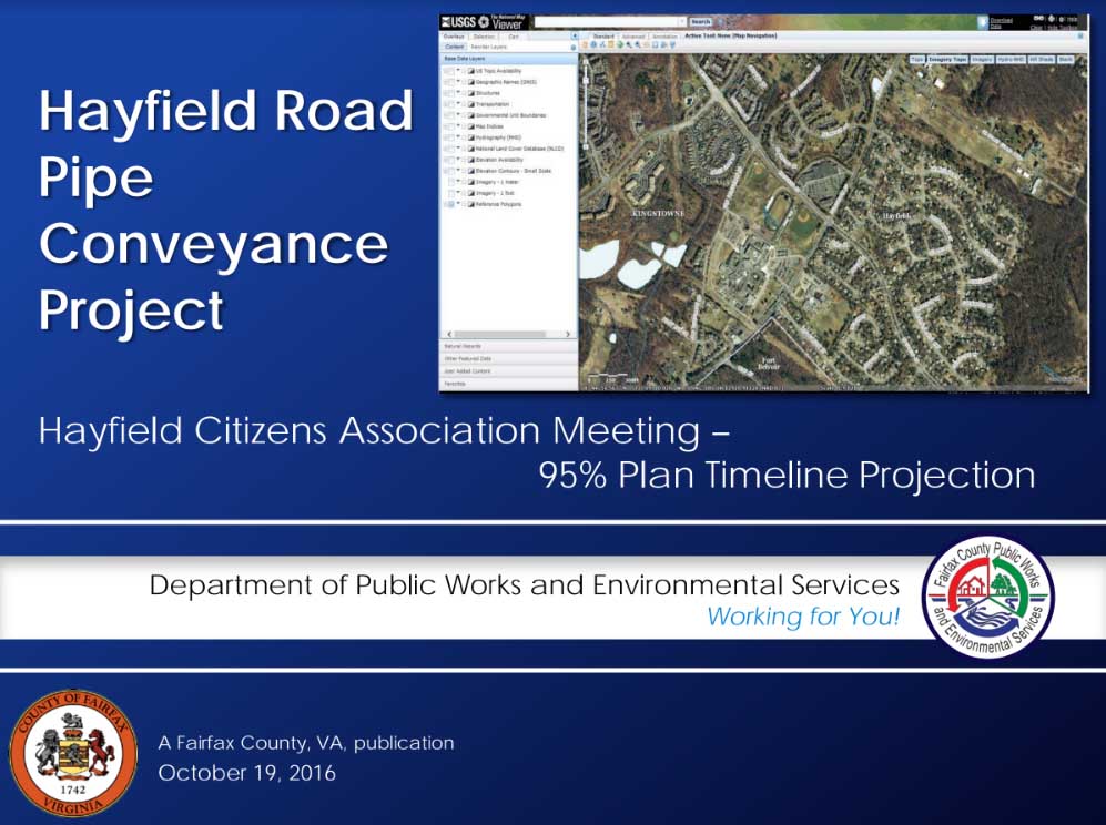 Contacts – Hayfield Farm residents may address any pipe project issues to Brendan Schillo, PE, Project Engineer, phone 703-659-7048, email Brendan.Schillo@fairfaxcounty.gov or to Dave Anglin, Section Chief, phone 703-324-5500, email Dave.Anglin@fairfaxcounty.gov.